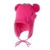 Knitted from organic cotton yarn, this thin and lightweight spring hat features a full cotton lining and chin ties to keep it in place even during active play. The hat has a cute bow on the front and two fun pom-poms on top.