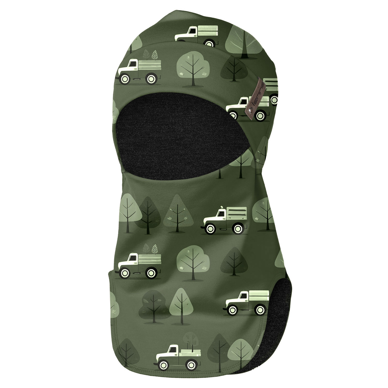The balaclava, made from a cotton blend fabric, features a merino wool lining. The neck part of the balaclava can be pulled down under the chin or worn higher on the face.