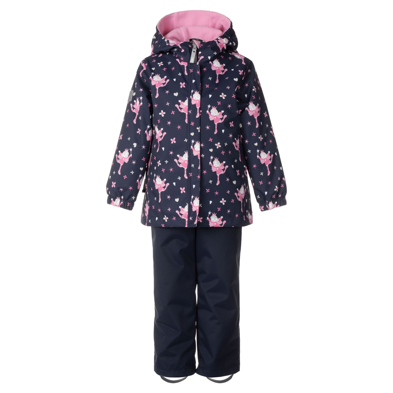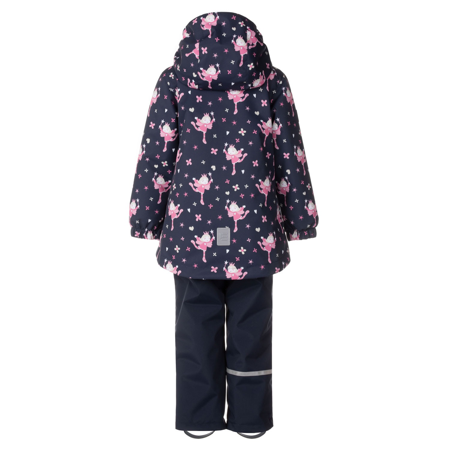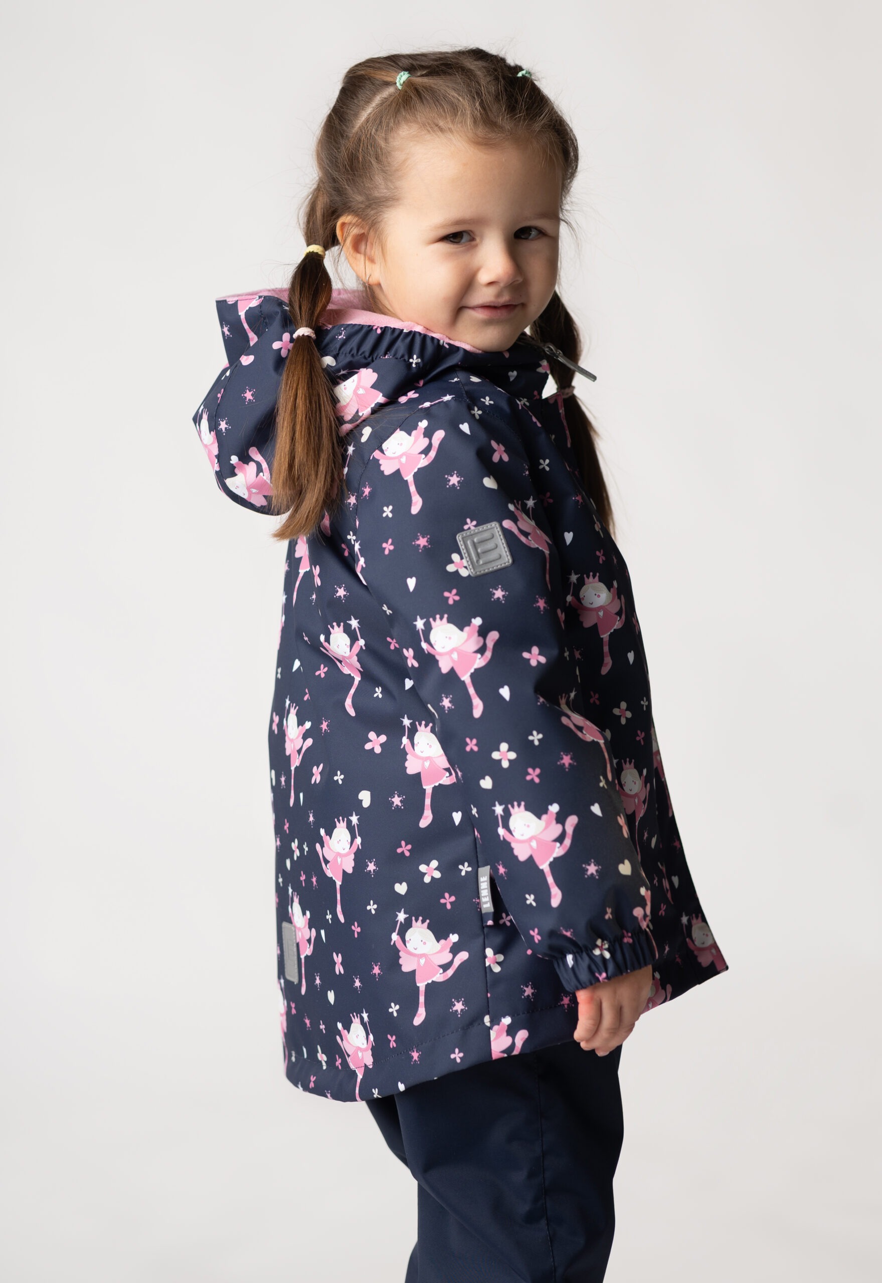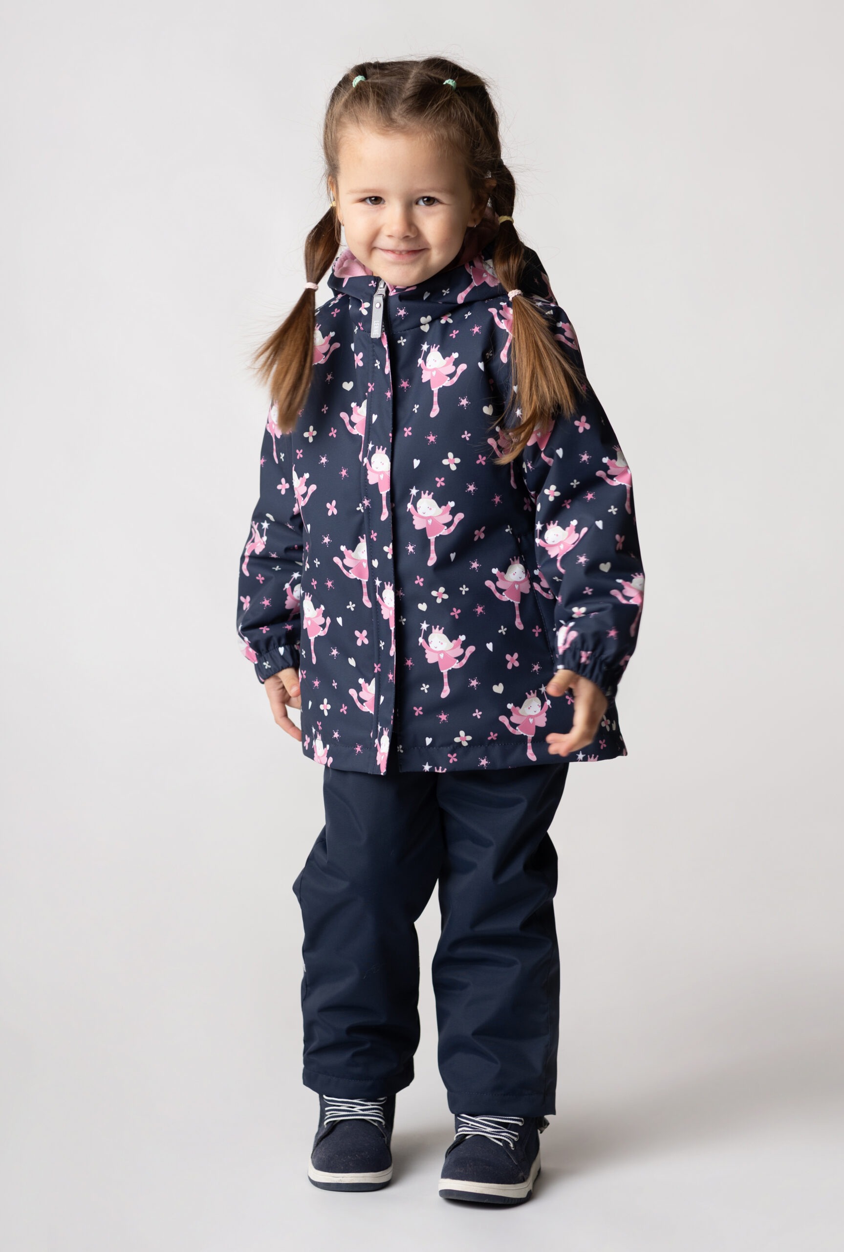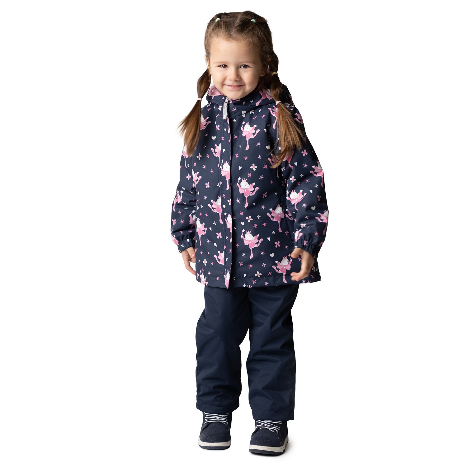 This girls’ set, crafted from weatherproof fabric, is a versatile and practical outfit for early spring through late autumn. Worn with the included windproof and waterproof bib pants under the jacket, it’s perfect for daily outdoor adventures. Pairing the jacket with jeans or more formal trousers creates a very comfortable and stylish casual outfit. The jacket has two zippered pockets where the child can hide their hands from the wind or safely store smaller gloves. The pants have practical foot loops.