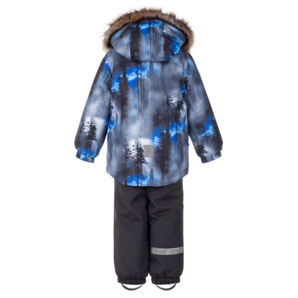 Efektse mustriga soe jope koos klassikaliste ühevärviliste talvepükstega on ilus ja praktiline talvine õuekomplekt. Reguleeritavate traksidega püksid lubavad komplekti kohandada lapse kasvuga. Pükste kõrgem pihaosa hoiab lapse selja soojas isegi suures mänguhoos. Disainis on kasutatud helkurdetaile, mis muudavad lapse nähtavaks ka pimedal talvel. Trukkidega kinnitatud kapuuts on turvaline, sest takerdumisel tuleb toote küljest lahti. Talvekomplektil on reguleeritavad ja eemaldatavad jalakummid hoiavad sääreosa kindlalt jalanõu peal.