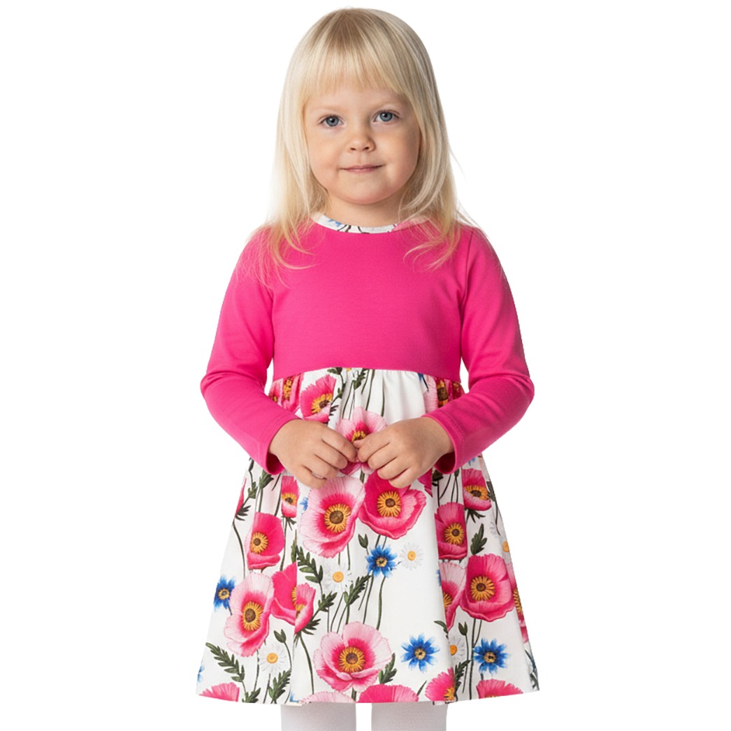 Pikade käistega puuvillane kleit, mis sobib nii mängupäevaks kui ka pidulikemaks hetkedeks. Ülemine osa ja varrukad on pehmest ühevärvilisest puuvillast, allosa aga rõõmsa ja kahara trükikangaga, mis liigub kaunilt lapse sammudega.